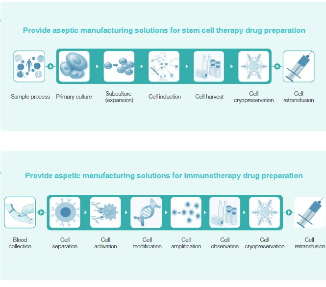 The large-scale manufacturing of CGT drugs must be conducted in a sterile environment. This is particularly critical during key steps such as cell separation, expansion, and modification, where any contamination can lead to batch failure or pose serious risks to patient safety. In this regard, the Cell and Gene Therapy Isolator provides a reliable safeguard. Specifically designed for cell drug manufacturing, the isolator is a sealed operational system that employs advanced air filtration and airtight isolation features to ensure a highly sterile and controllable environment for cell handling.