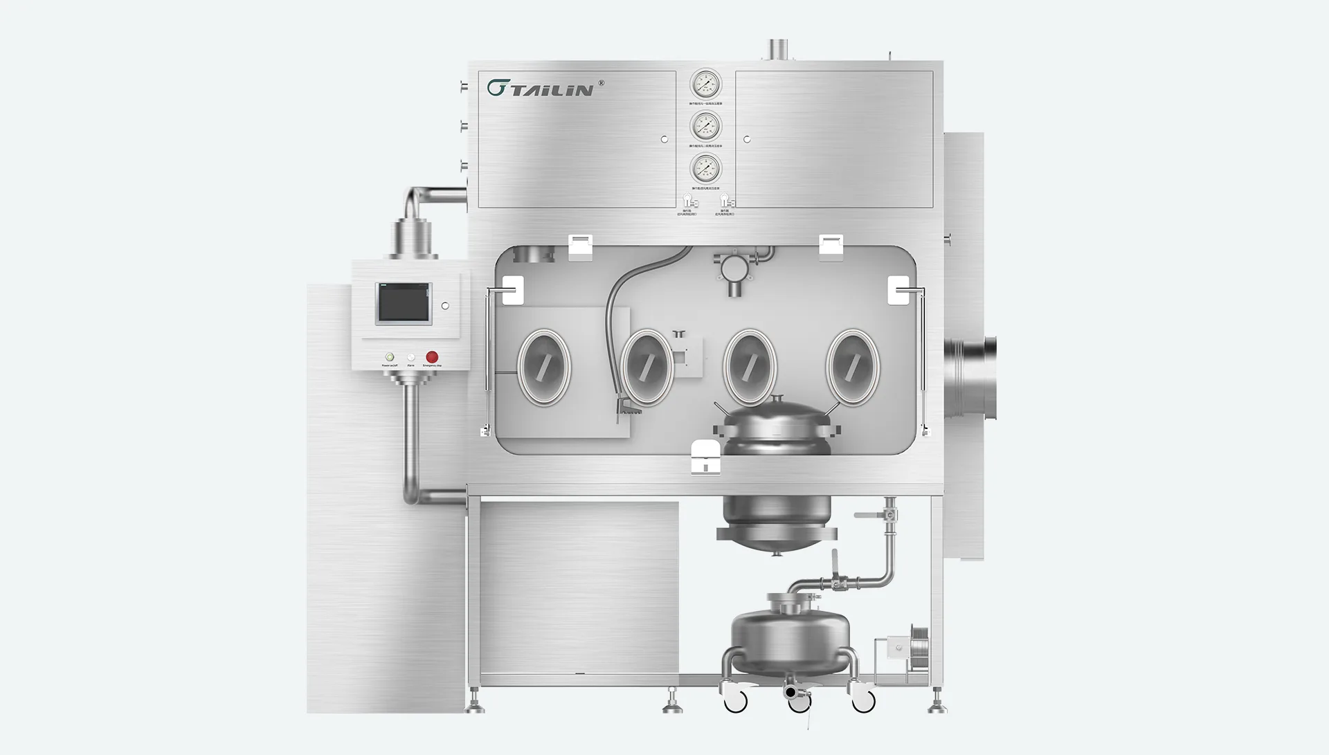 Tailin Containment Isolator is designed to protect operators during operations such as weighing, dispensing, drying, pressing, and filling of highly potent and toxic products. It is mainly applied in pharmaceuticals, cosmetics, bioproduct research, and physico-chemical laboratory studies. The system generates turbulent airflow through a high-pressure exhaust fan, maintaining negative pressure inside the working area. This design effectively prevents cross-contamination between internal and external environments, ensuring the safety of both personnel and the surrounding environment.