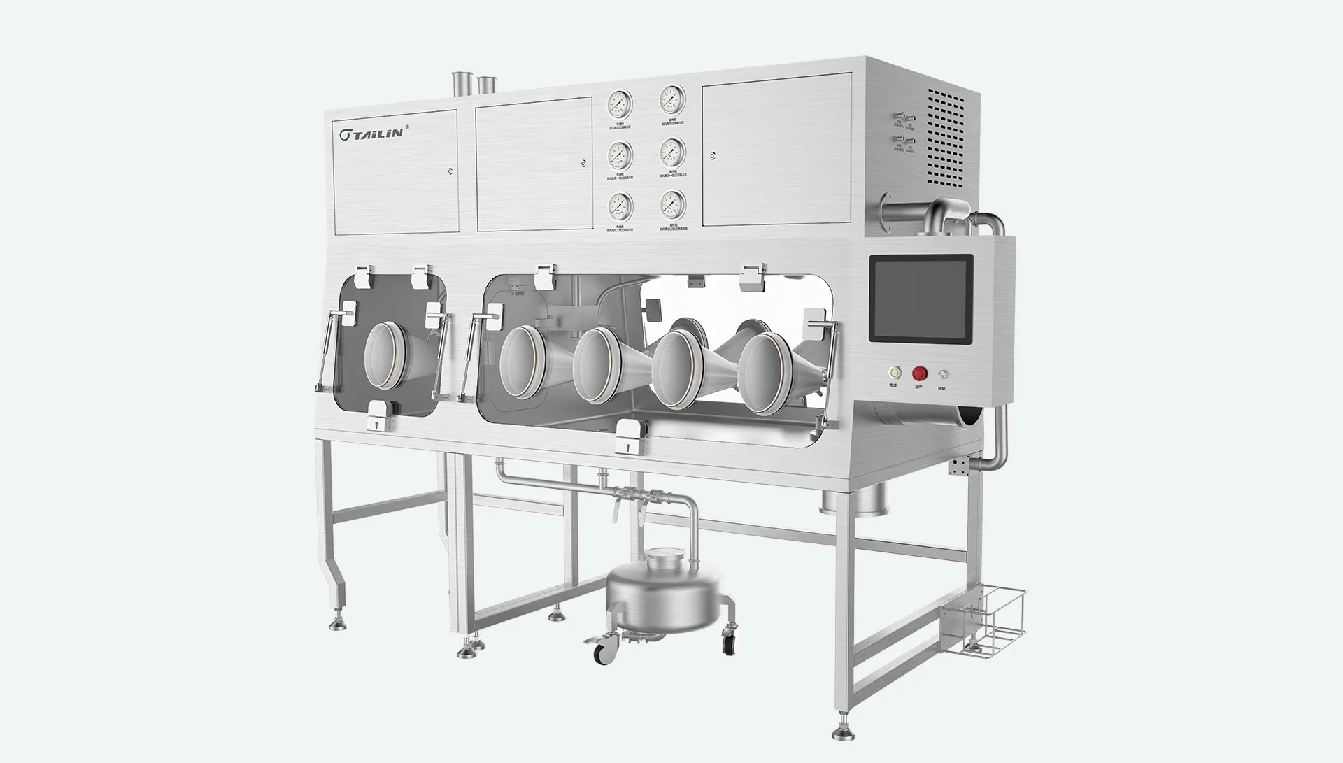 Tailin Containment Isolator is designed to protect operators during operations such as weighing, dispensing, drying, pressing, and filling of highly potent and toxic products. It is mainly applied in pharmaceuticals, cosmetics, bioproduct research, and physico-chemical laboratory studies. The system generates turbulent airflow through a high-pressure exhaust fan, maintaining negative pressure inside the working area. This design effectively prevents cross-contamination between internal and external environments, ensuring the safety of both personnel and the surrounding environment.