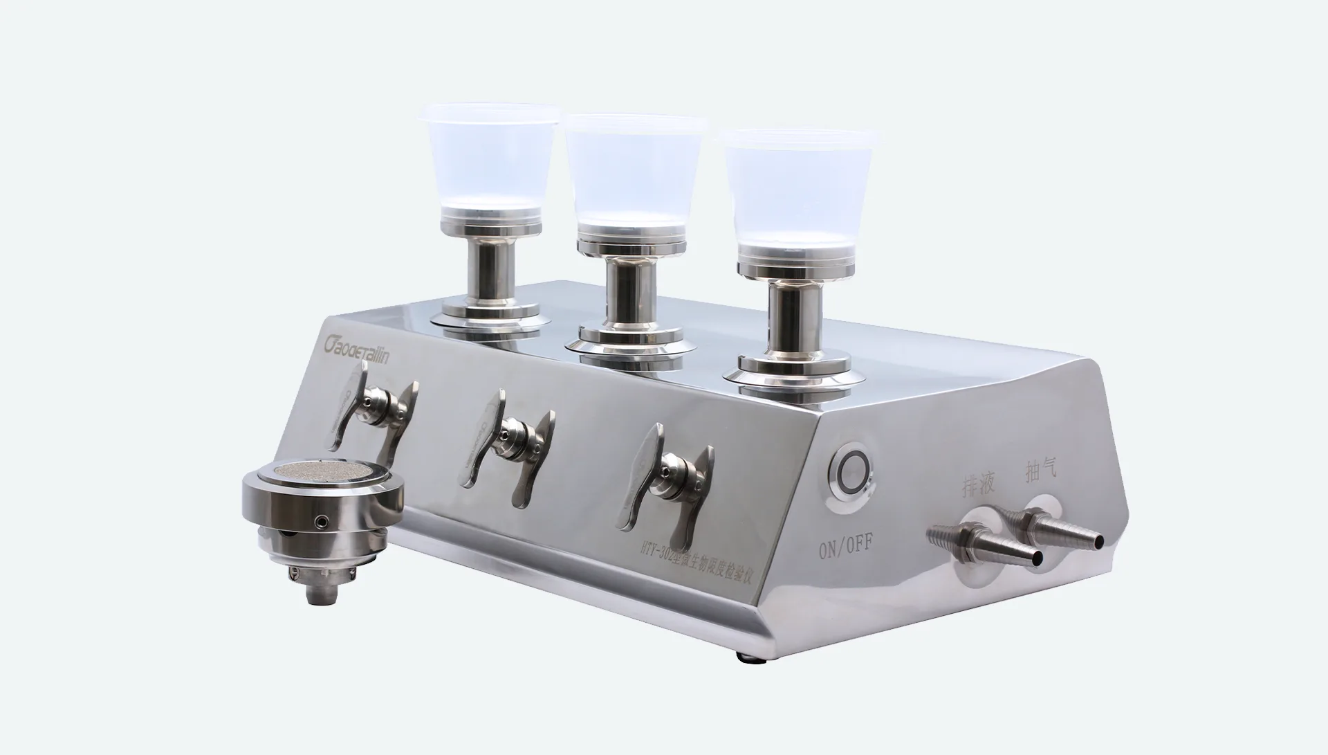 The HTY-302 Microbial Limit Tester is a specialized device designed according to pharmacopeia requirements. It is equipped with three pump heads and uses a high-performance vacuum pump in conjunction with a waste liquid bottle. By using different pump heads with funnels or canisters, it forms a complete membrane-filtration setup. During testing, the sample is filtered to retain microorganisms on the membrane, which are then cultured into visible colonies for counting to determine microbial levels.