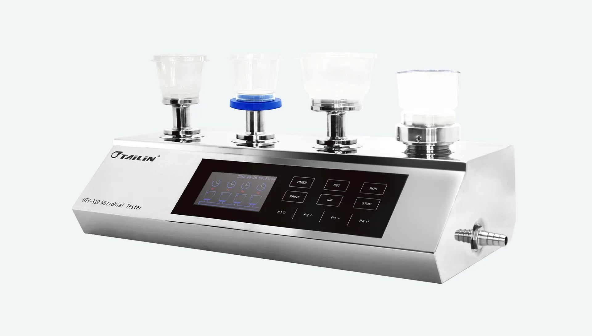 The HTY-310 Microbial Limit Tester is a specialized device designed according to pharmacopeia requirements. It features four pump heads, SIP sterilization, high-performance diaphragm pump, and direct waste discharge. By using different pump heads with funnels or canisters, it forms a complete membrane-filtration setup. During testing, the sample is filtered to retain microorganisms on the membrane, which are then cultured into visible colonies for counting to determine microbial levels.