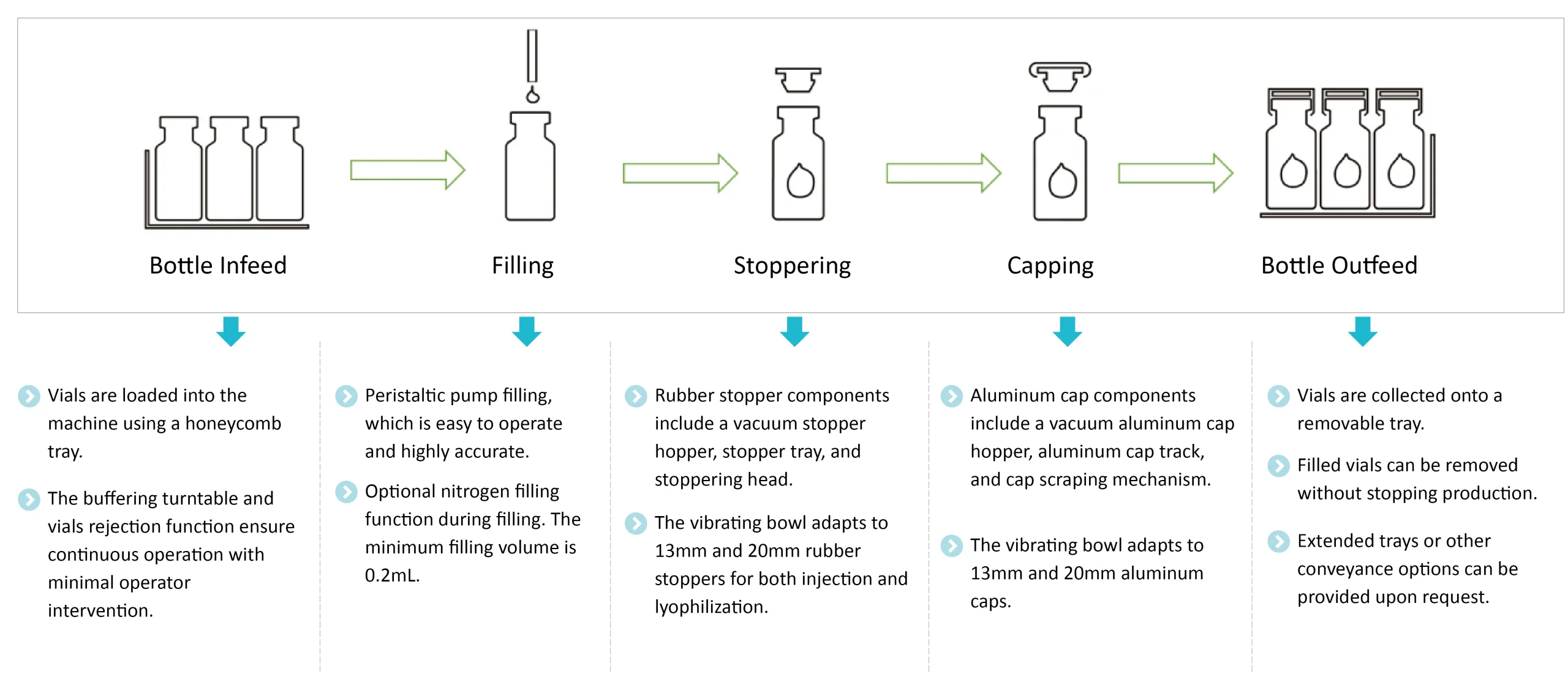 • Standard Version: Suitable for filling, stoppering, and capping processes with standard rubber stoppers and aluminum-plastic caps.