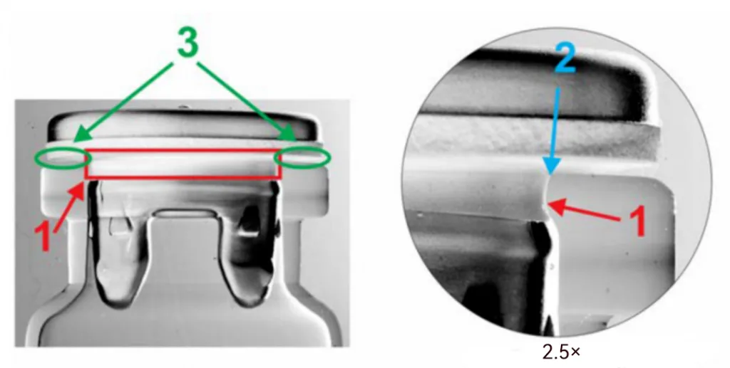 It must also be pointed out that the top surface of the vial mouth is not perfectly perpendicular to the neck; there is a slight angle. Therefore, even after stoppering and pressing, a small gap remains between the stopper flange and the vial rim. Without sufficient pressure on the stopper flange, this location is highly prone to leakage.